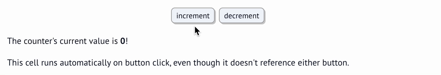 For cases like these, marimo provides the function mo.state(), which creates a state object and returns a getter and setter function. When you call the setter function in one cell, all other cells that reference the getter function via a global variable are automatically run (similar to UI elements).