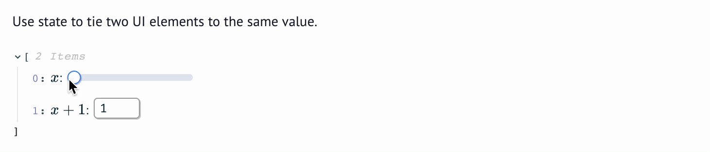 Notice that we created the slider and number elements in different cells. When tying elements, this is necessary, because calling a setter in a cell queues all other cells reading the state to run, not including the one that just called the setter.